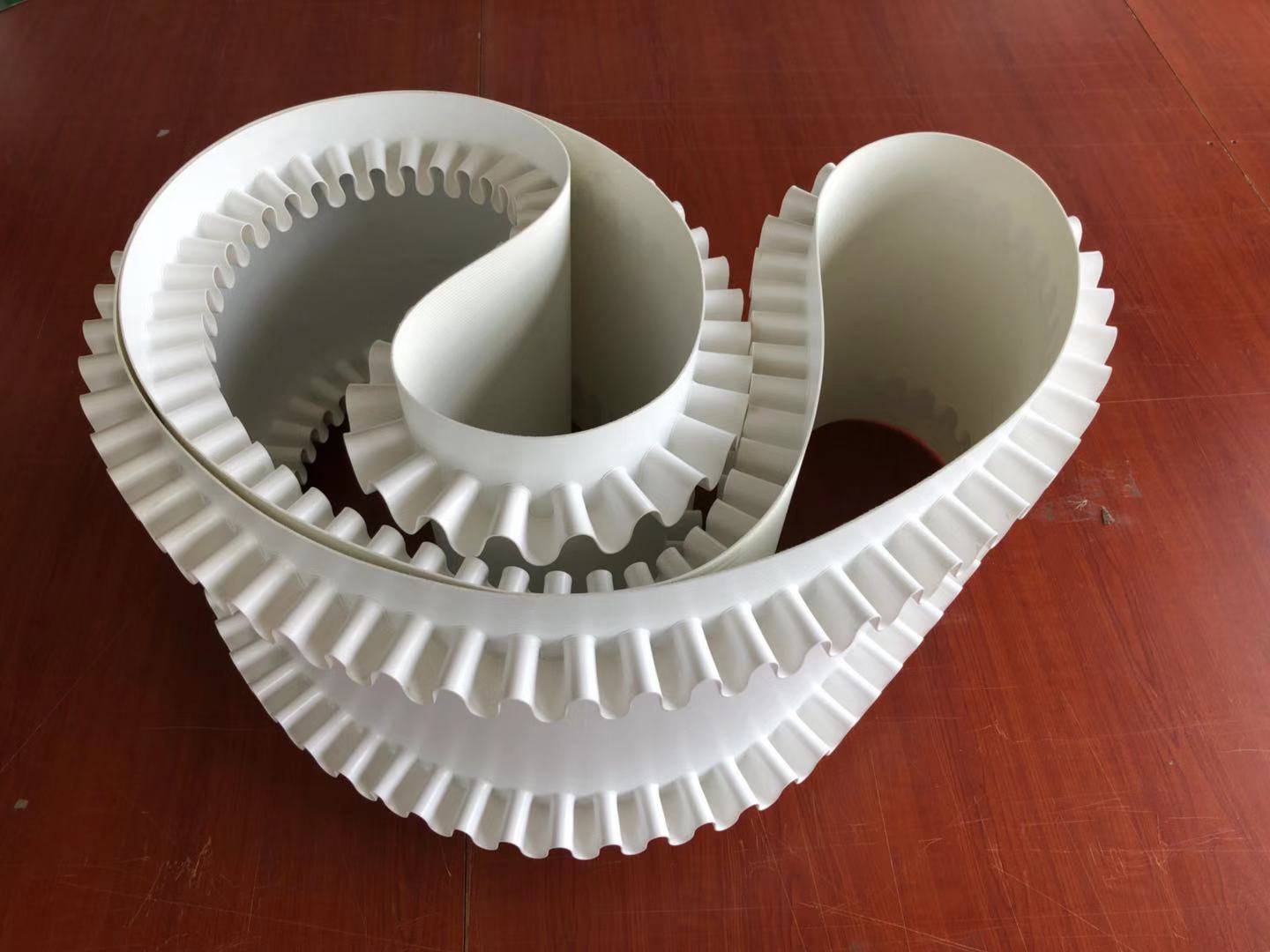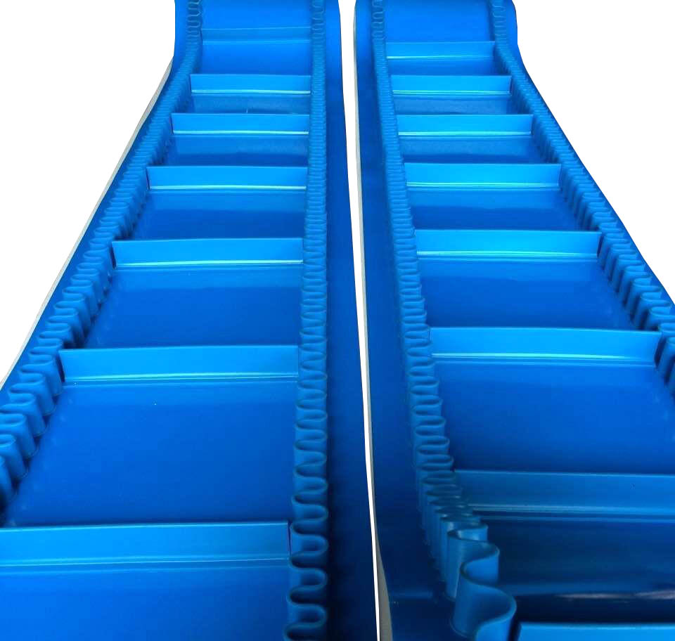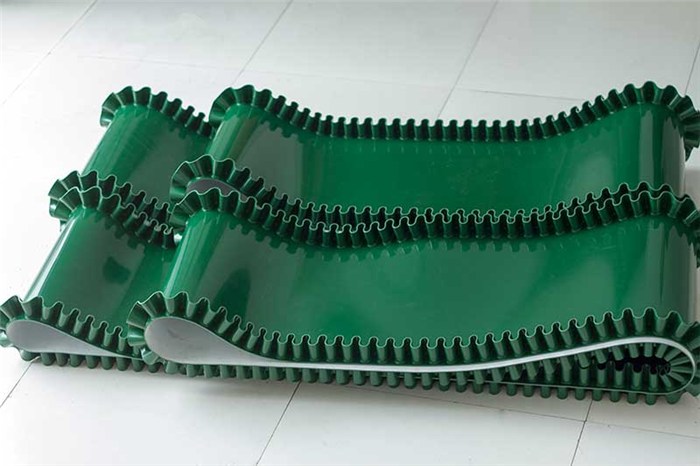 輸送帶(裙邊擋板帶),擋邊起防止物料測滑撒落的作用。為便于轉彎,裙邊設計成波紋狀;橫隔板的作用是承托物料,為了實現(xiàn)大傾角輸送,采用T型TC型。檔邊和橫隔板是用二次硫化的方法與基帶連接的,具有很高的連接強度。用于輸送易散落的粉狀、粒狀、小塊狀、糊狀及液態(tài)狀物料。